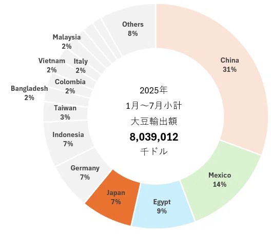 中国は現在、米国産大豆を一切発注していない。米国が大豆の収穫の最盛期を迎えようとする中、季節初めの需要の95%をブラジル産で賄っている。ブラジルは南半球に位置するため、収穫期がほぼ逆となる。これに加え、アルゼンチンが穀物輸出に対する輸出税を一時的に撤廃したことから、中国は同国からの大豆輸入も開始した。米国、ブラジル、アルゼンチンは、世界三大大豆生産国だ。