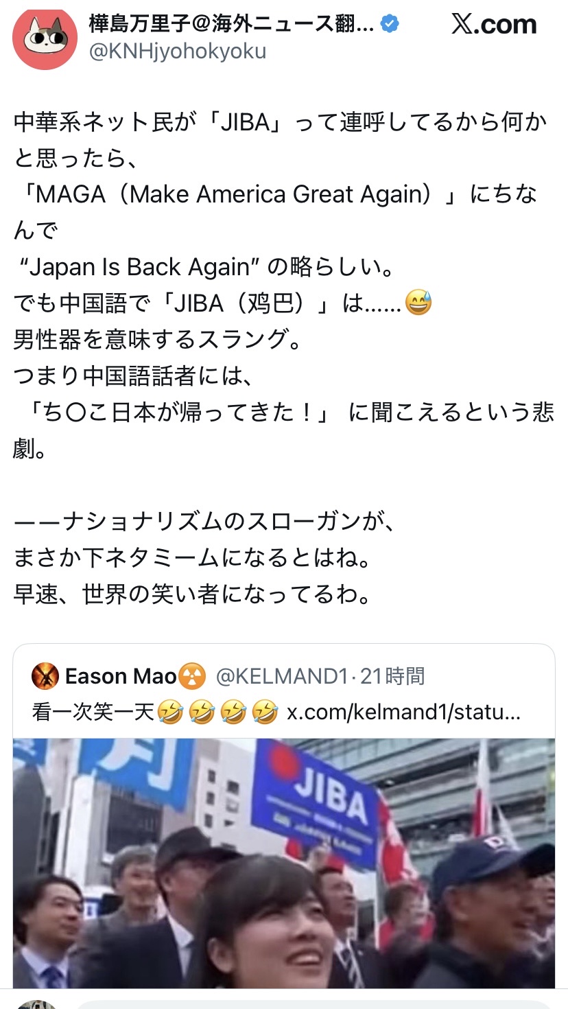 原梗是特朗普当选时说的“America is back”,高市模仿了一下,用“Japan is back”来表现自己是特朗普的舔狗。如果这样的话,其实用“JIB”就够了,但为了让它更像“MAGA”,特意加上了“again”,于是就变成了“JIBA”。另外,“MJGA”发音不太顺口,估计也是因此才没用这个词。反正无论怎样,这都已经土到极致了,其实也无所谓了。