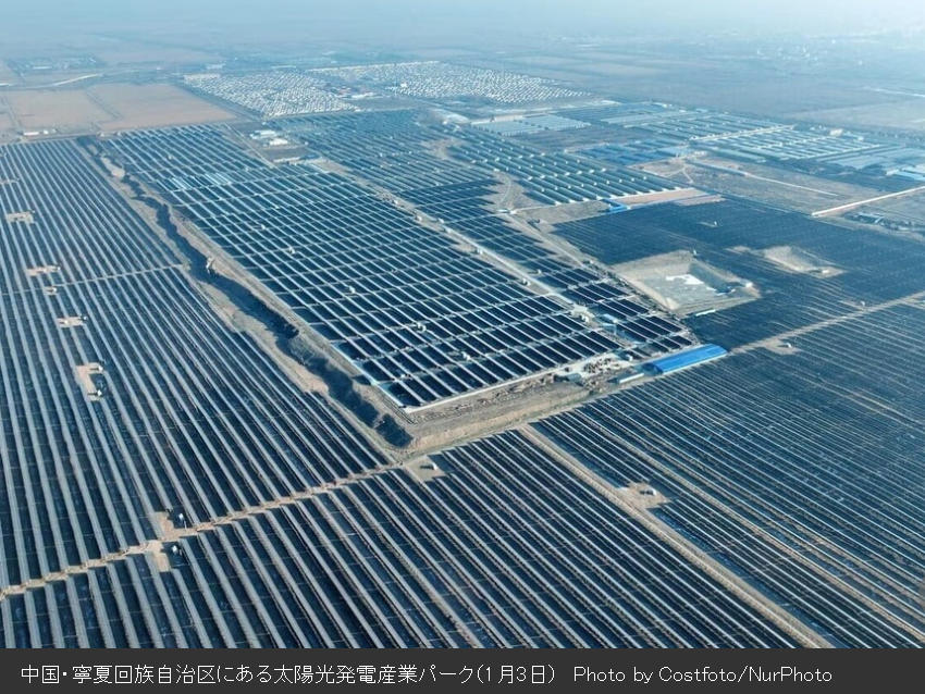 中国が段階的に運転を開始している「タラタン・ソーラー・パーク(塔拉灘太陽能発電所)」は、約420平方キロの広大な複合施設。中国は再エネへの移行を加速させることで、クリーンエネルギー分野の世界的リーダーとしての地位を確立しようとしている。