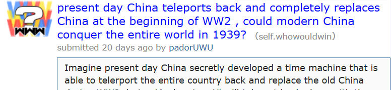 但中国在1937年就被入侵并参与二战了。这怎么办?被侵略的中国突然被2025年未被侵略的版本取代了吗?日本士兵还在那儿,还是凭空消失了?日本能维持占领区而其他地区都变成2025年的样子吗?