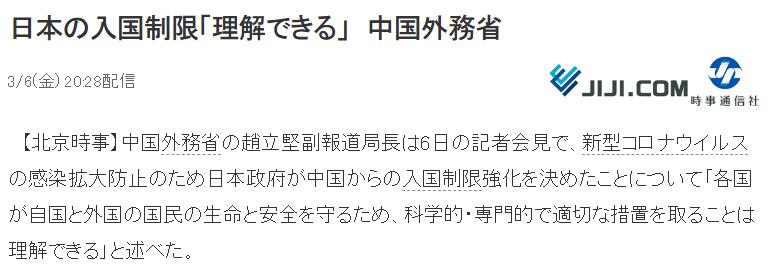 “为了防止感染扩散,日本政府决定加强对从中国入境的限制“各国为保护本国和外国国民的生命和安全,采取科学、专业和适当的措施,是可以理解的”